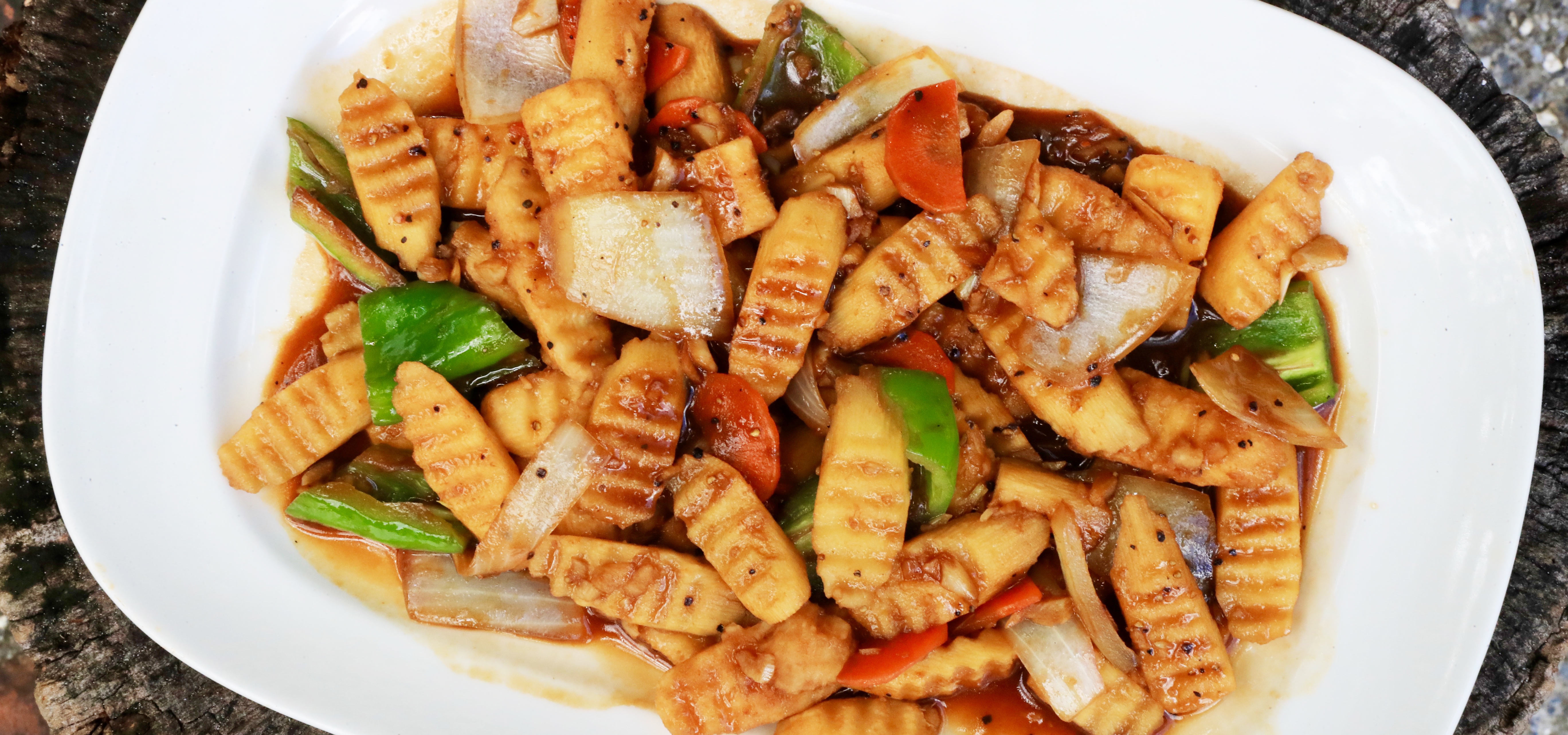 綠竹園山薯農場位於環山竹林之中,佔地1公頃,農場主人陳俊龍與家族在田園裡種植蔬菜,過著自給自足的農夫生活。陳俊龍說,祖先自清代來此定居,農場週邊全是親戚,家人都有辦桌的廚房經驗,自己在學校學的雖然是工科,因為打工也對餐飲產生興趣,退伍之後先在北海岸開起行動咖啡車,一邊做一邊思考未來。