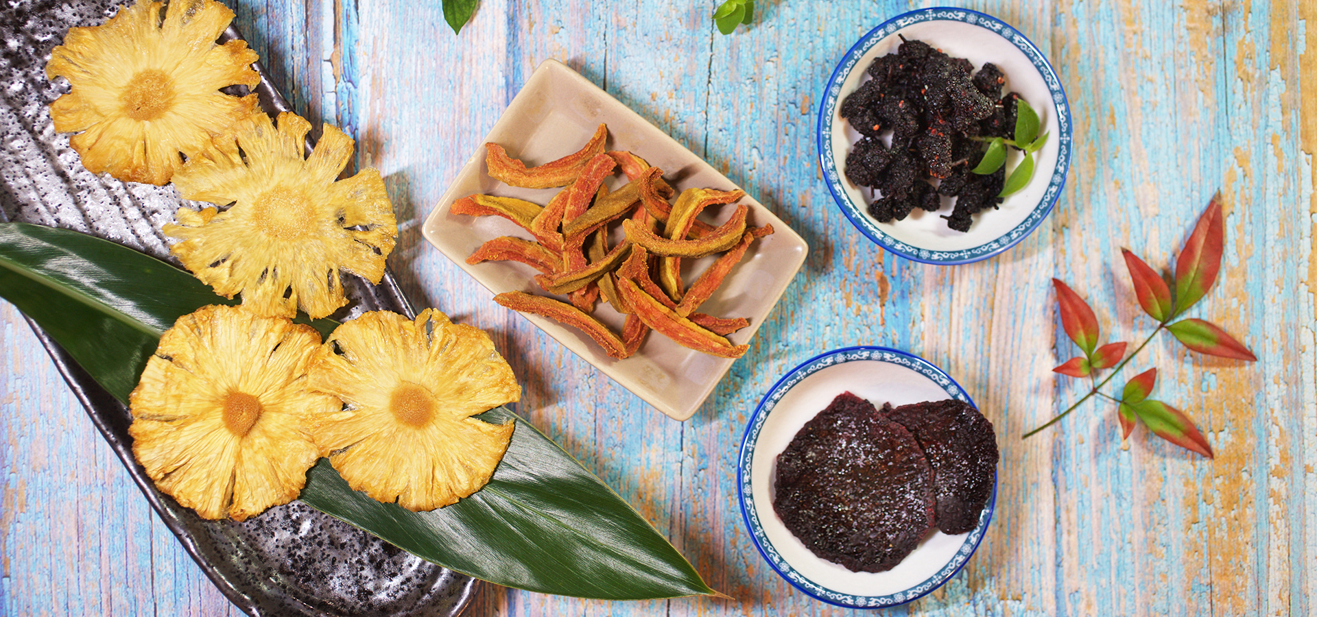 另外鳳梨果乾吃起來口感軟硬適中,也是經典好味,火龍果則是從1公分厚烘縮到薄薄一片,不僅甜度高,還保留適宜水份,咀嚼時還能吃到輕脆的火龍果籽,清明節前後採自家栽種的桑椹做成的果乾更是人氣商品,製作過程中使用少許台糖液態糖及進口海藻糖,藉此保鮮、提味。