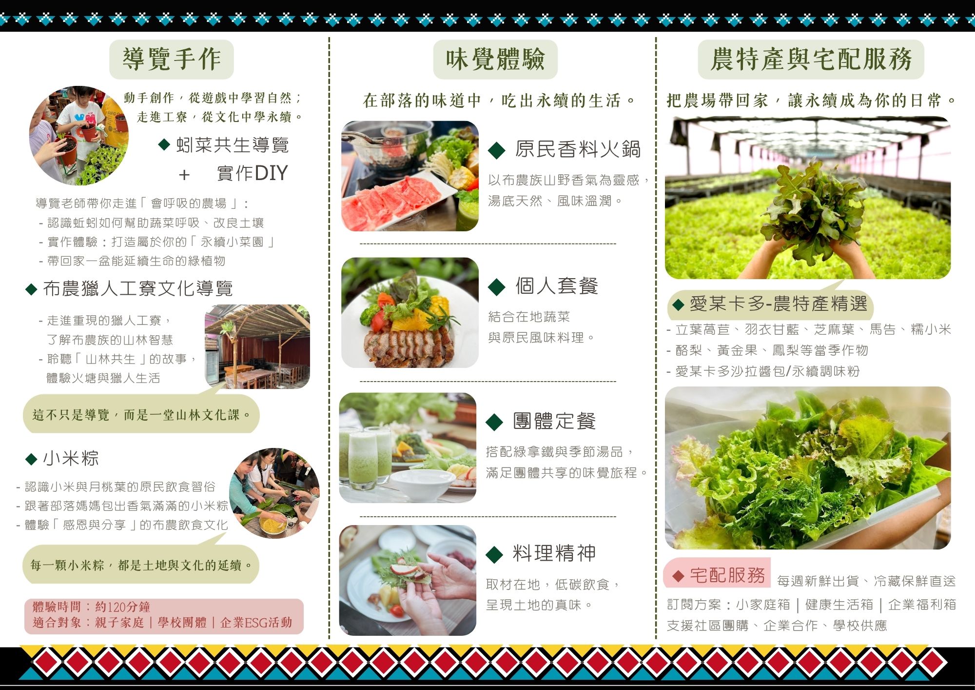 百漾說,不只動手,還能動口吃到最天然的生菜料理。除了招牌綠拿鐵,原住民的烤肉生菜,還有常見的火鍋、水果沙拉,都是以最簡單的料理方式呈現真正的新鮮,「來愛某卡多,可是會忘了挑食」。此外,現場還提供生菜包、蚓糞肥等伴手禮。