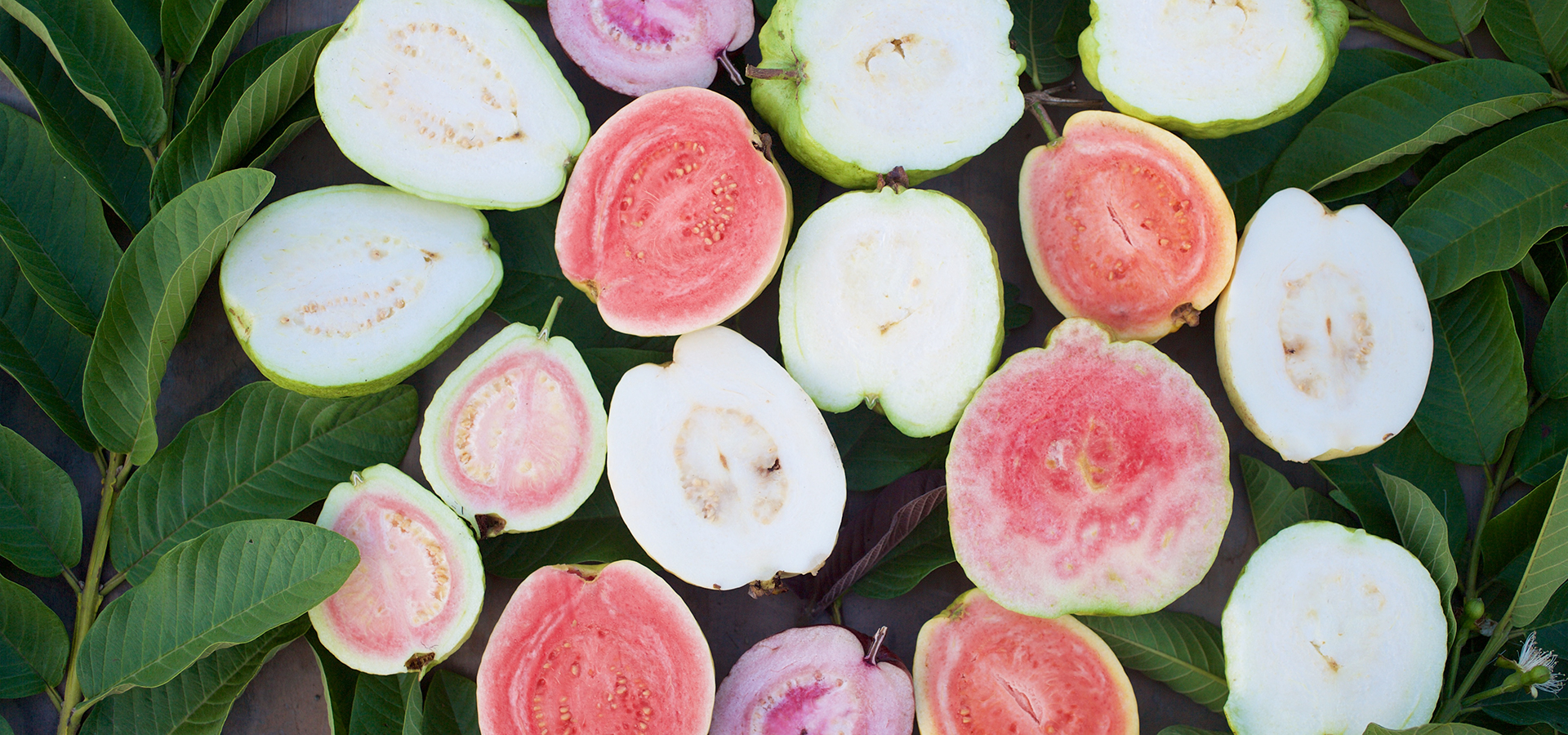 達哥如數家珍的介紹著包括最常聽到的珍珠芭樂、帝王芭樂、胭脂芭樂,還有水晶芭樂、蜜香芭樂、紅寶石芭樂、黃金芭樂、紫芋芭樂、水蜜芭樂、草莓芭樂、榕樹芭樂、西瓜芭樂、香水芭樂等共有十幾種,達哥自豪的說:「現在芭樂品種最多的應該就屬我們家了」。而達嫂將切開的芭樂全部擺放在盒子裡,香氣十足的芭樂色彩繽紛,什麼顏色都有,相當吸睛。