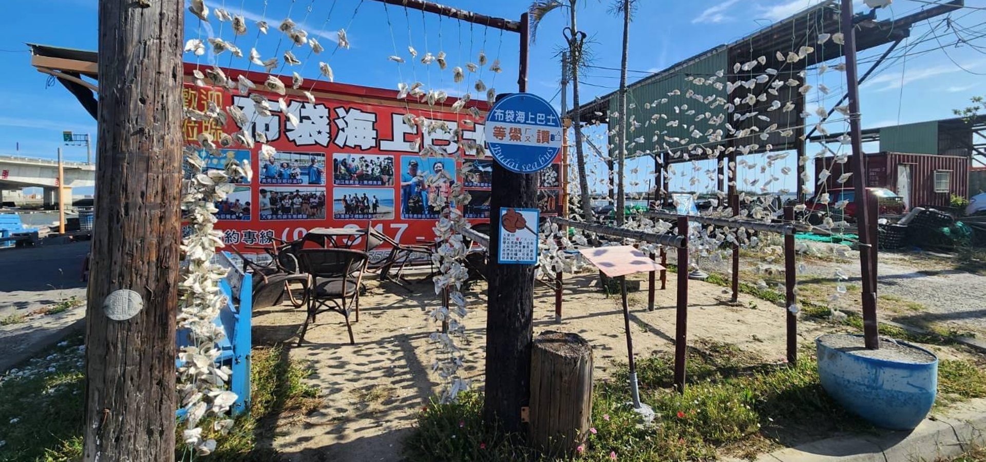 為了推廣海洋教育,陳船長利用廢棄的蚵棚做成裝置藝術,搭建了一個「客棧」,再利用蚵殼做一個蚵簾,取名「布袋蠔好玩」,而「萍水相逢」則是隨著洋流潮汐飄來的海中廢棄物酒瓶做成的吊飾,現在都成了網美拍照的打卡點。