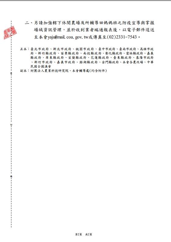 檢送休閒農場及田媽媽班因應嚴重特殊傳染性肺炎( COVID-19 , 簡稱武漢肺炎) 注意事項及處理