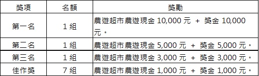 選出農遊最佳故事獎前10名,各頒發獎狀1紙,競賽獎項如下: