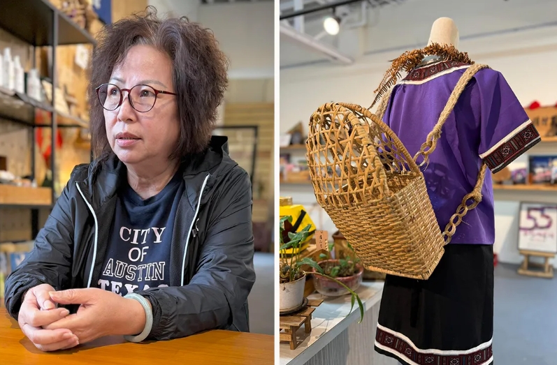 (左)日光小林社區發展協會理事長潘枝梅;(右)大武壠族傳統服飾與竹編背簍,呈現過往日常使用的器物樣貌。(圖片來源:微笑台灣)